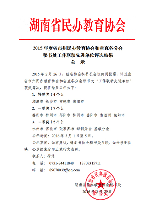 2015年度省市州民辦教育協(xié)會(huì)和省直各分會(huì)秘書(shū)處工作聯(lián)動(dòng)先進(jìn)單位評(píng)選結(jié)果公示