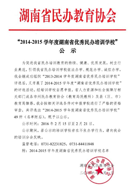 湖南省民辦教育協(xié)會(huì)“2014-2015學(xué)年度湖南省優(yōu)秀民辦培訓(xùn)學(xué)?!惫?/h5>