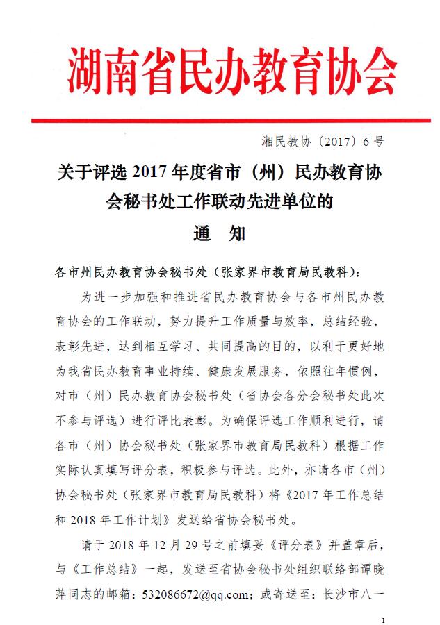 關于評選2017年度省市(州)民辦教育協(xié)會秘書處工作聯(lián)動先進單位的通知