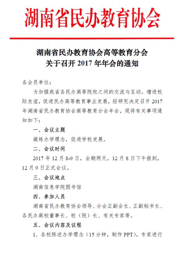 湖南省民辦教育協(xié)會(huì)高等教育分會(huì)關(guān)于召開(kāi)2017年年會(huì)的通知