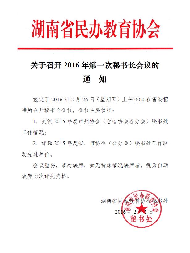 湖南省民辦教育協(xié)會(huì)關(guān)于召開(kāi)2016年第一次秘書(shū)長(zhǎng)會(huì)議的通知