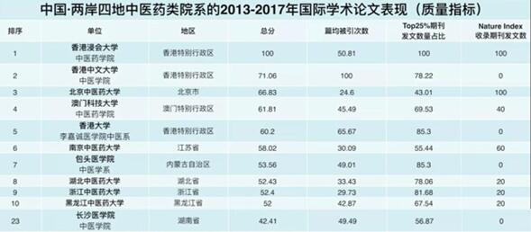 長沙醫(yī)學(xué)院中醫(yī)學(xué)院在《中國·兩岸四地中醫(yī)藥類院系的2013-2017年國際學(xué)術(shù)論文表現(xiàn)(質(zhì)量指標(biāo))》中排名第23位