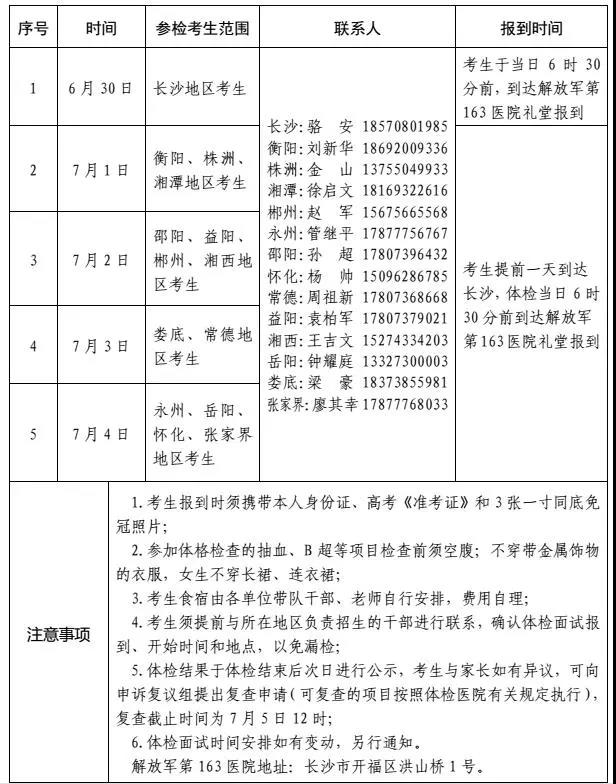 一、湖南省2018年軍隊院校招生體檢面試安排表