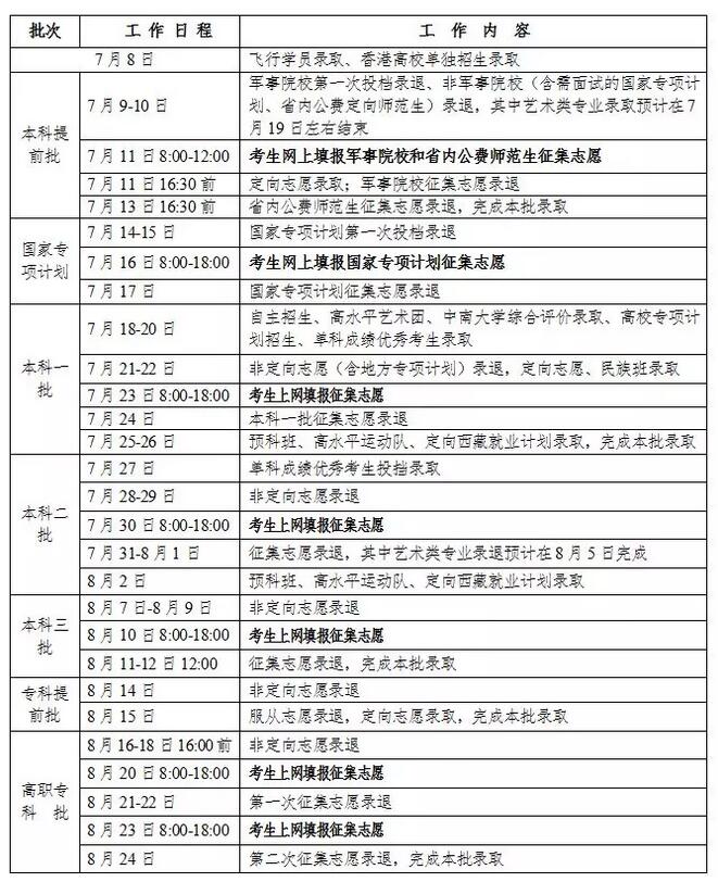 我省的招生錄取工作分六批進(jìn)行,各批次錄取的院校和時(shí)間安排如下: