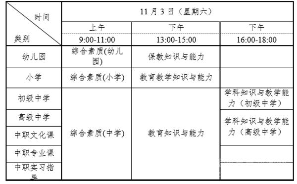 2018年下半年中小學教師資格考試筆試考生報名日期為9月4日至9日;考生網(wǎng)上繳費截止日期為9月14日;考生打印準考證時間為10月29日至11月3日。