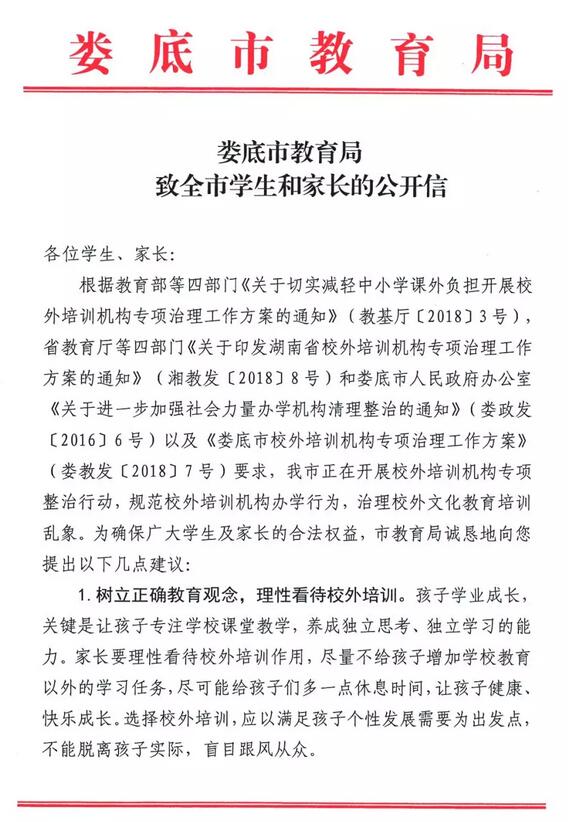 關(guān)于校外培訓(xùn),致學(xué)生家長(zhǎng)的一封信(附婁底市經(jīng)審批的校外培訓(xùn)機(jī)構(gòu)名單)
